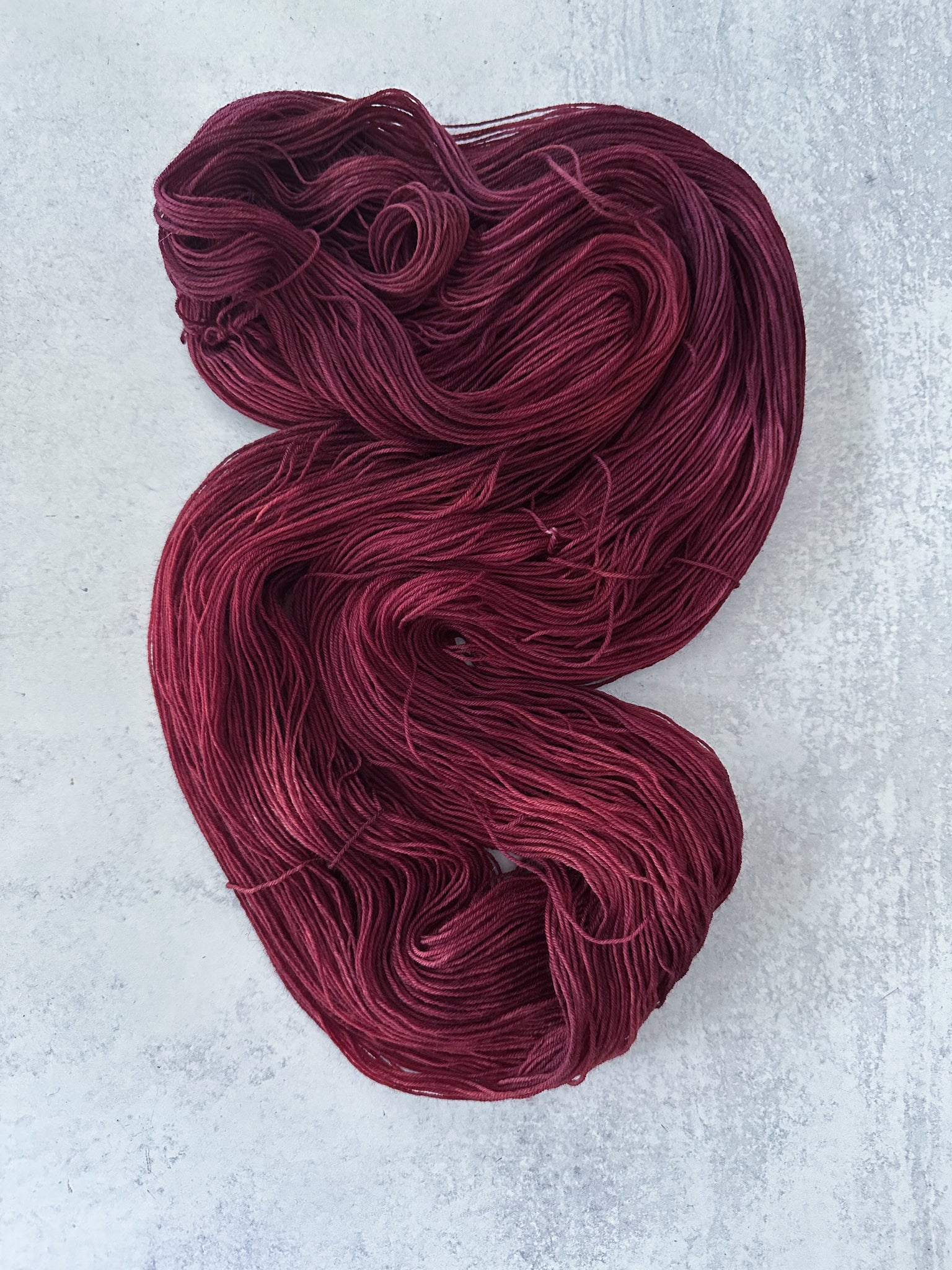 Due to the nature of hand-dyed yarn, I recommend that you alternate skeins in larger projects. There are often variations even within the same dyelot.