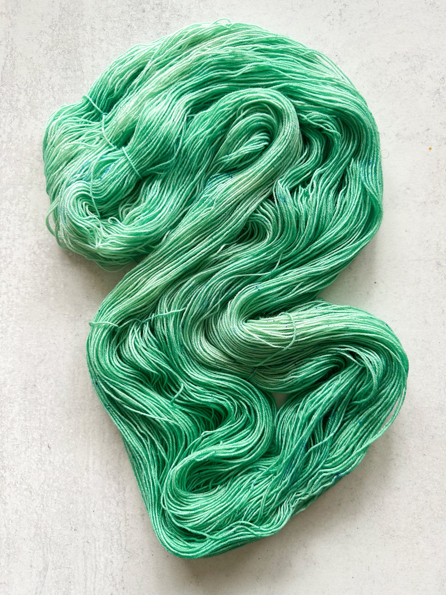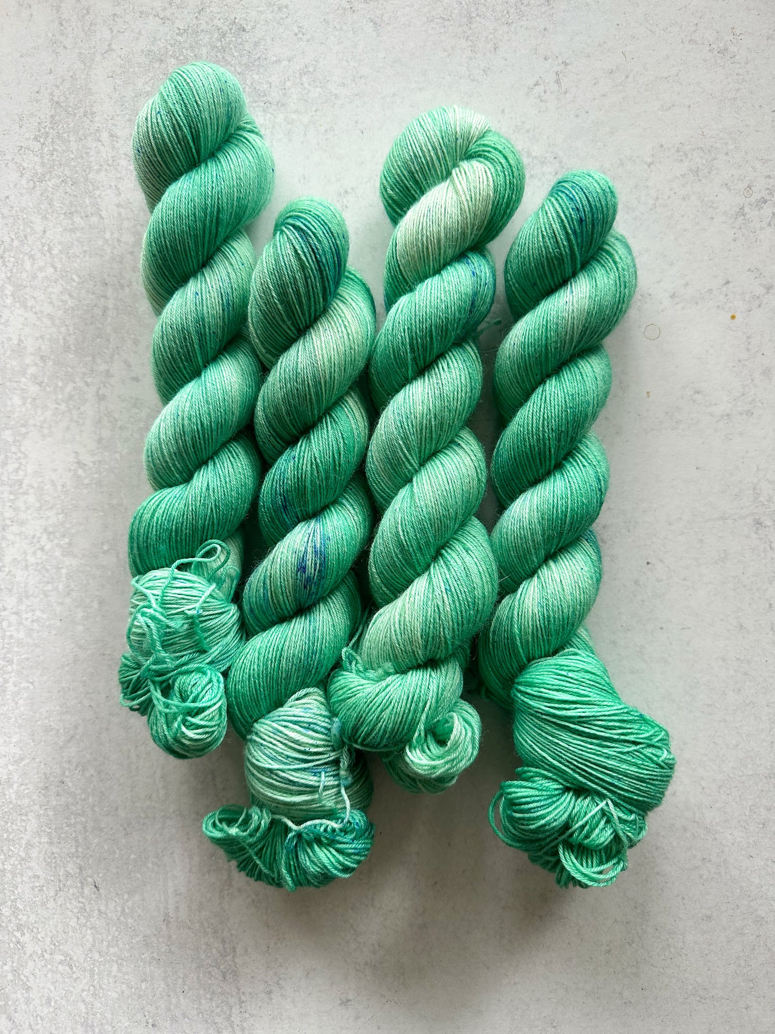 Harlequin is a saturated seafoam green tonal. (Your skein might have some blue microspeckles thanks to the nature of one of the dye colors!)