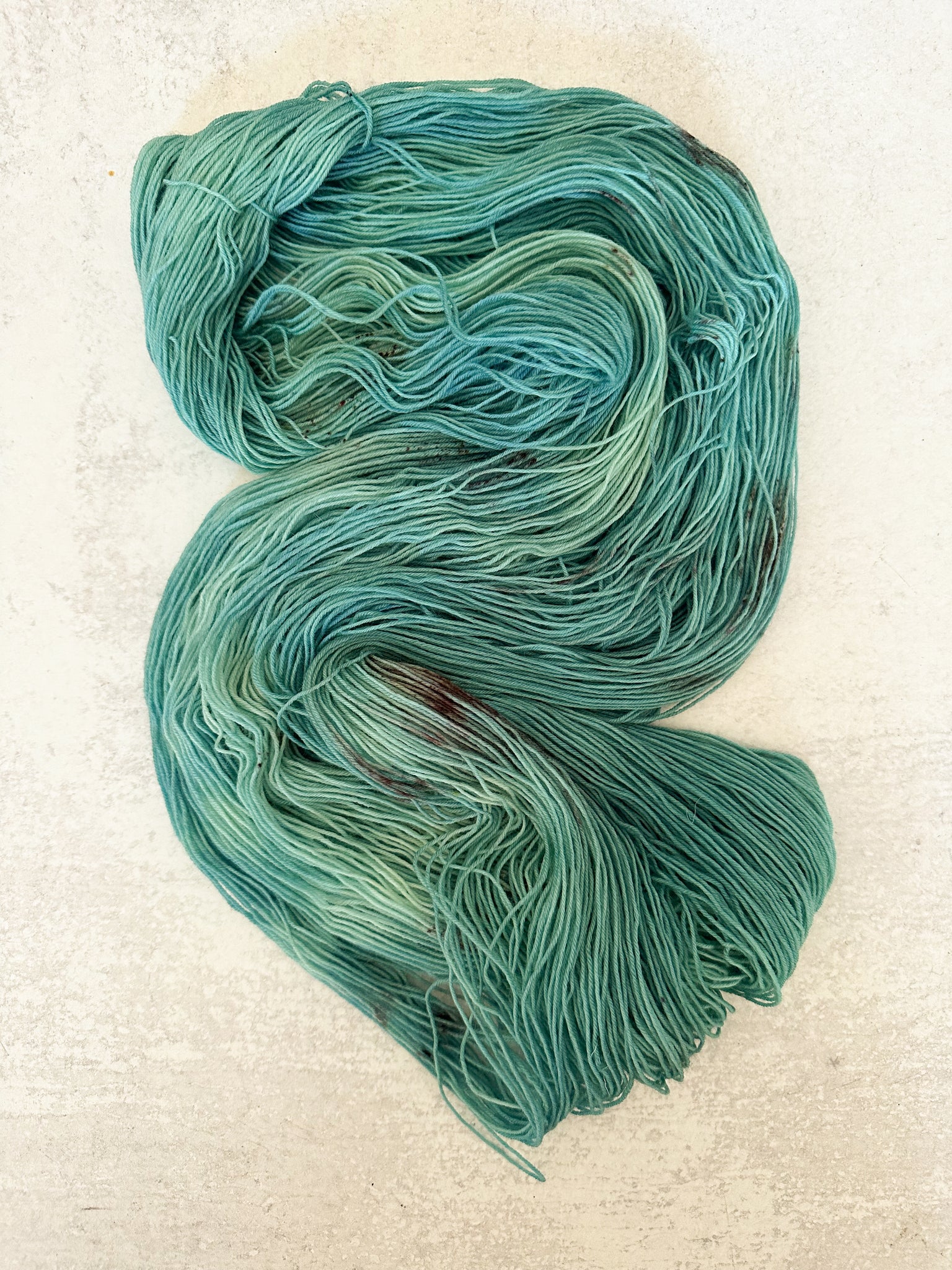 A tribute to robins eggs and my favorite campfire song, The Prettiest Egg That You Ever Did See is has dark brown speckles on a light blue green background (just like a robin's egg!). It looks fabulous with Ramble On (burnt orange).